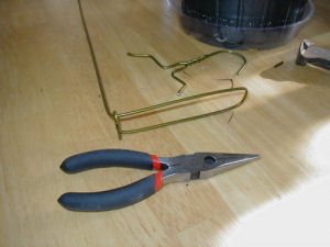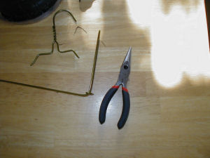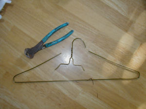 Find a wire clothes hanger (sturdy - flimsy won't do!) and remove top with wire clippers. Discard top and straighten remaining section with needle-nose pliers.