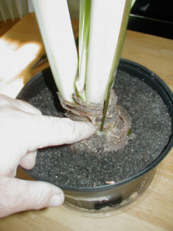 Insert the stake into Amaryllis as close to the bulb nose as possible. Push stake through the bulb until it contacts the bottom of the pot. Hint: make sure to insert on the 'leaf edge' side of the bulb. This will ensure that no emerging flowers are damaged by the stake.